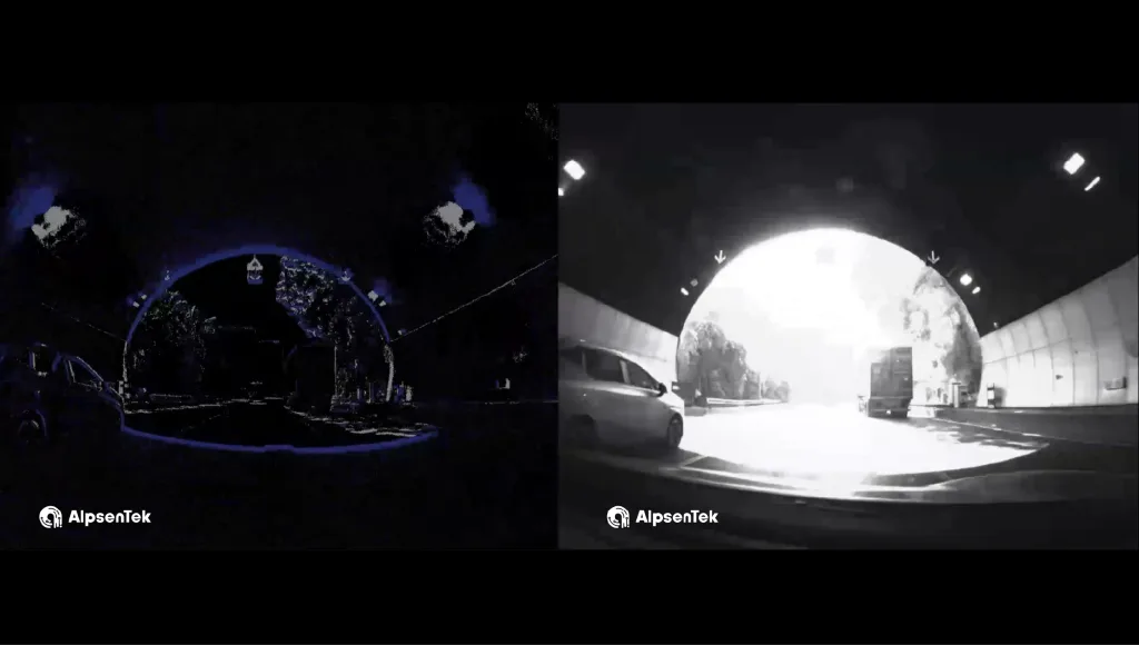 图4:在车辆逆光驶出隧道等快速变化场景,EVS的动态范围和数据量优势,可快速探测到前方障碍物,减少制动系统时间,提升主动安全