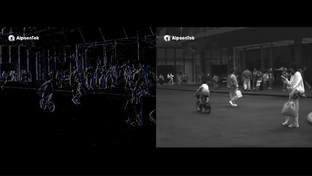 图5:HVS融合传感器APX014(ALPIX -Pizol)在移动中实时捕捉街景:事件(左)/ 图像(右)。APX014采用全局快门和单色图像模式,提供130万像素APS/EVS分辨率