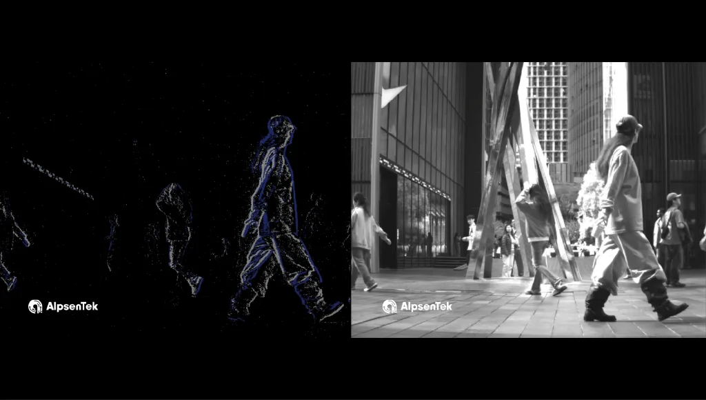 图6:HVS融合传感器APX014(ALPIX -Pizol)实时捕捉行人运动:事件(左)/ 图像(右)。APX014采用全局快门和单色图像模式,提供130万像素APS/EVS分辨率