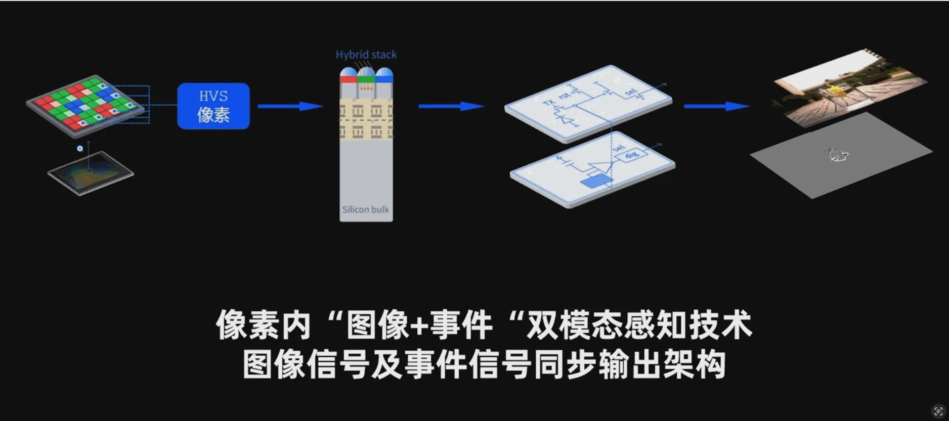 HVS(Hybrid Vision Sensor)融合视觉技术由 AlpsenTek 原创,采用像素级事件图像融合设计,在同一像素阵列中集成图像采样链路与事件检测电路。通过像素内感存算一体结构设计,采用 iampCOMB, GESP 或 IN-PULSE DiADC 架构与时分复用读出机制( PixMUX 架构),基于高端的实现图像与事件的可选输出,支持图像模式、事件模式与融合模式三种工作形态,兼顾成像完整性与动态响应能力。采用 BSI 堆叠工艺及先进的像素间隔离工艺,兼顾了极致像素尺寸及良好的光电性能。